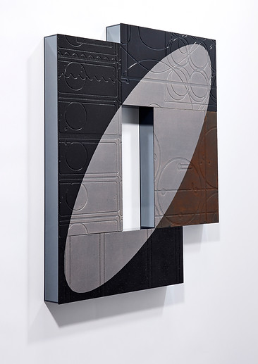 Carefully selecting the ‘found’ tracery patterns, Melamed unifies the disparate surfaces through spatial arrangement and the application of paint – in particular, by employing a spotlight effect that appears to bathe each object in focused illumination.